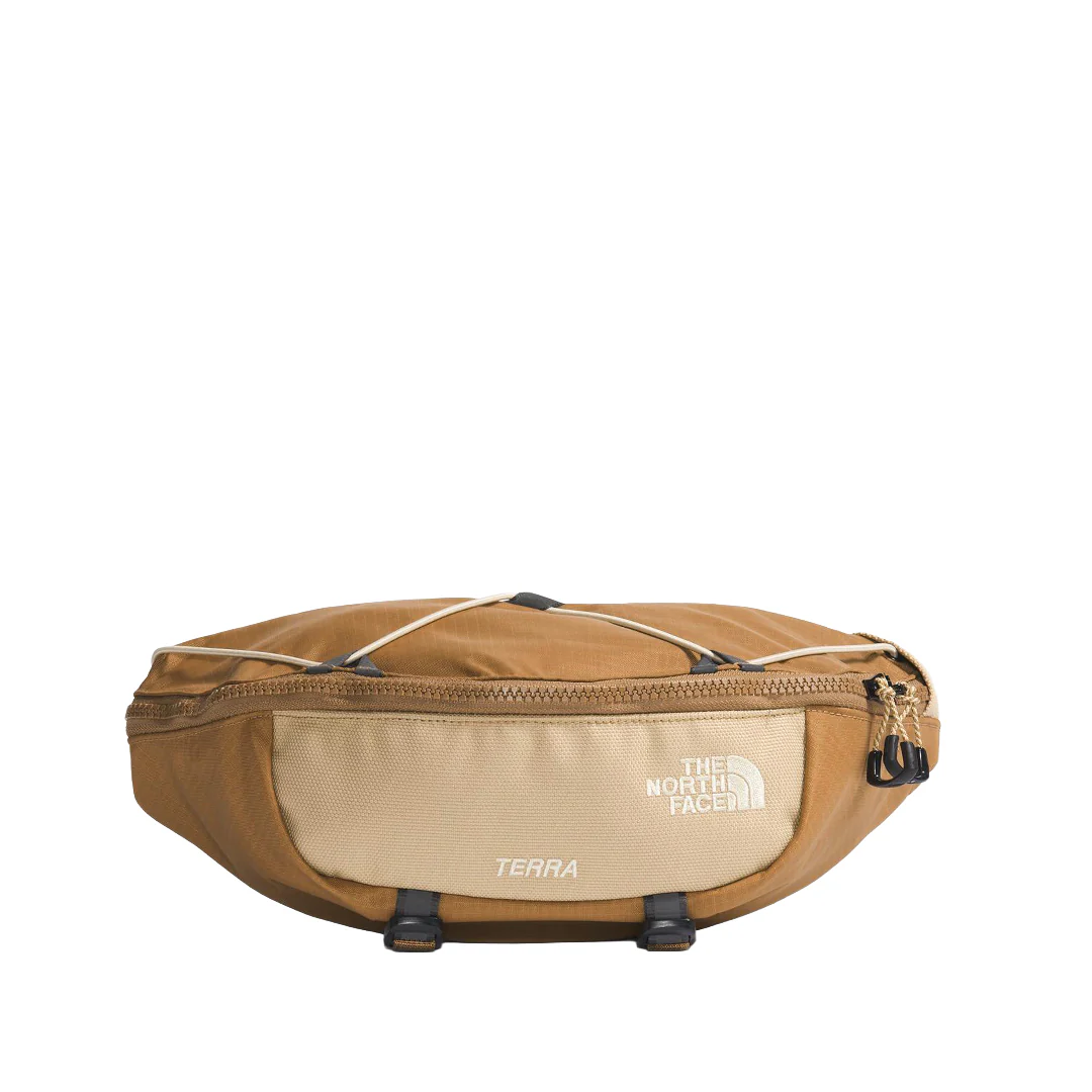 Canguro Terra Lumbar 3L unisex en color café, fabricado en materiales reciclados con acabado DWR sin PFC. Compartimento principal para lo esencial, bolsillos internos con gancho para llaves, bungee externo, panel trasero acolchado y correa ajustable.