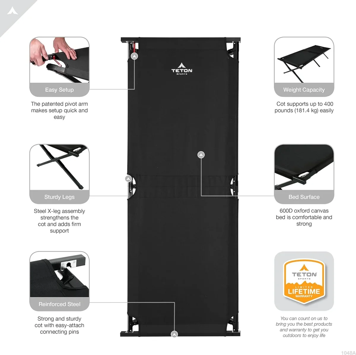 Les platicamos acerca del catre plegable «Adventurer» de TETON, nos propusimos crear un catre plegable súper resistente que fuera tan cómodo como tu cama en casa y que además fuera fácil de armar. Su alta resistencia radica en el diseño de las patas en forma de X de acero, con una capacidad de carga de 181 kg (400 libras).