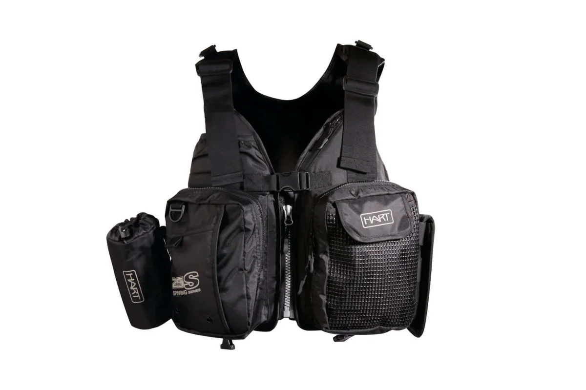 Chaleco de la marca Hart, modelo 25S Spinning, en color negro, perfecto para tener a mano todos tus utensilios durante tu sesión de pesca.