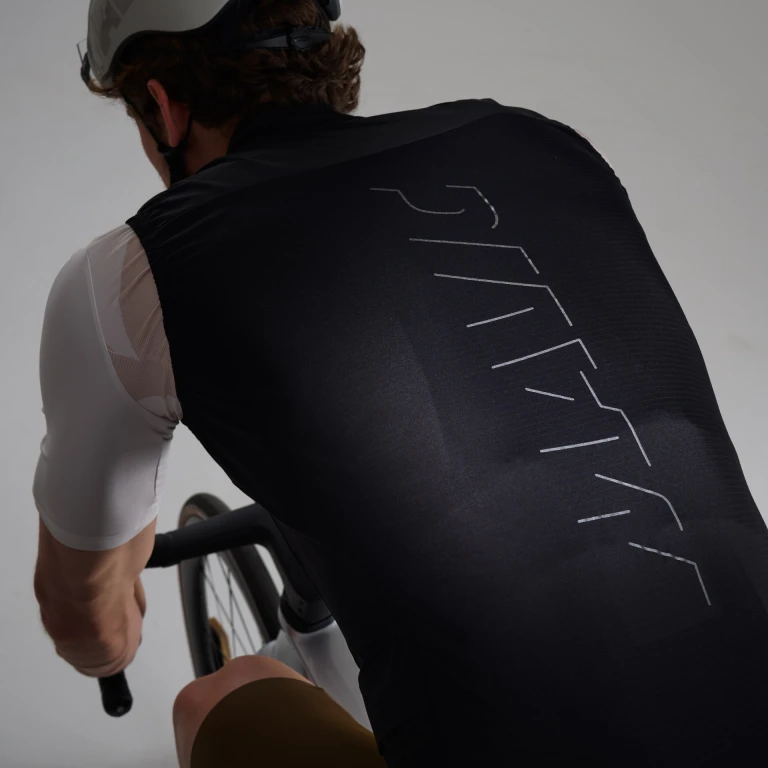 El chaleco está confeccionado con Wind SL Fabric, un material resistente que protege eficazmente del viento y de la lluvia ligera. Este tejido actúa como una barrera frente al aire frío, ayudando a mantener la temperatura corporal estable sin generar exceso de calor.