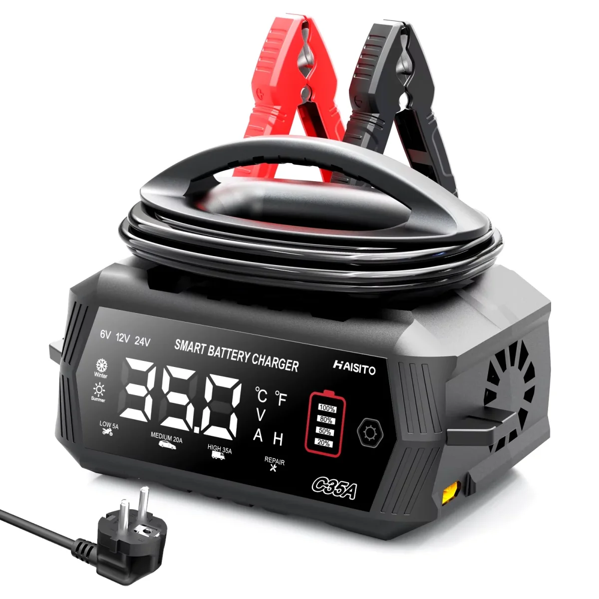 - Courant de sortie : 6V (max 10A) / 12V (max 35A) / 24V (max 18A)