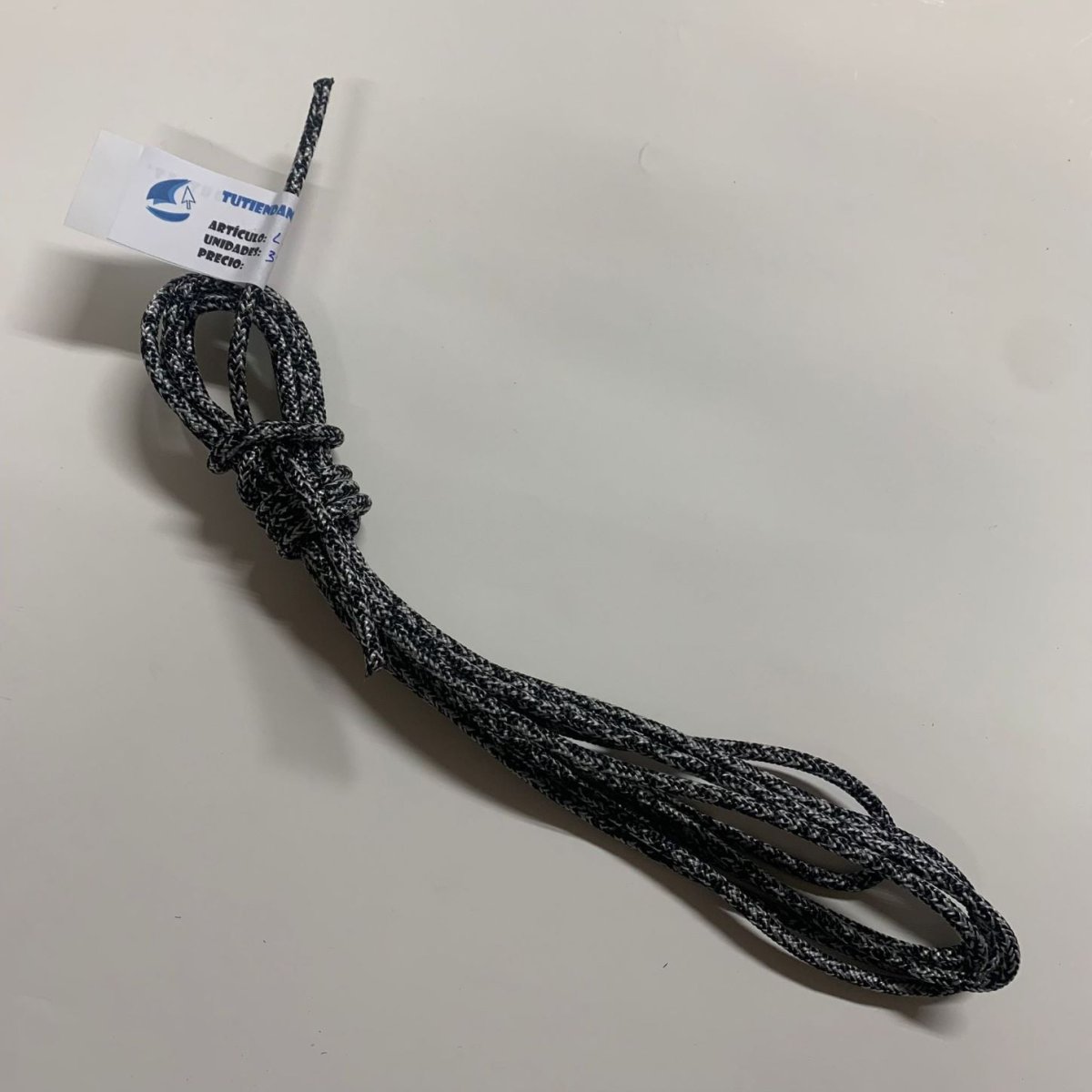 Trozo de cuerda de poliéster de alta tenacidad preestirado de 12 mm de diámetro y 5,5 m de largo en color melange negro. Fabricado en doble trenzado con alma de 12 husos.