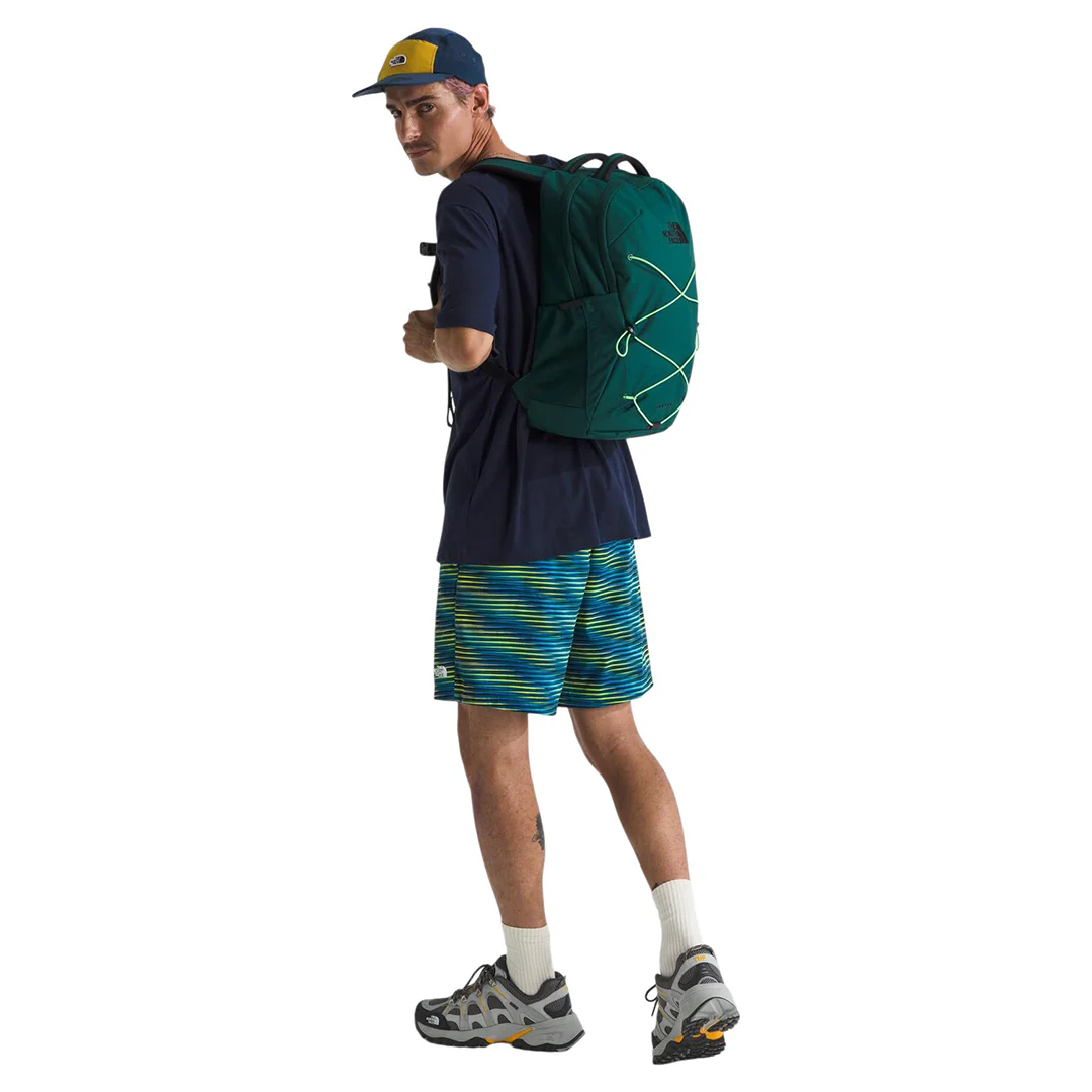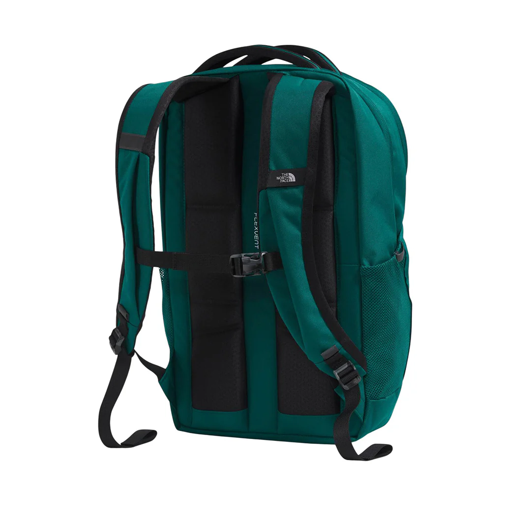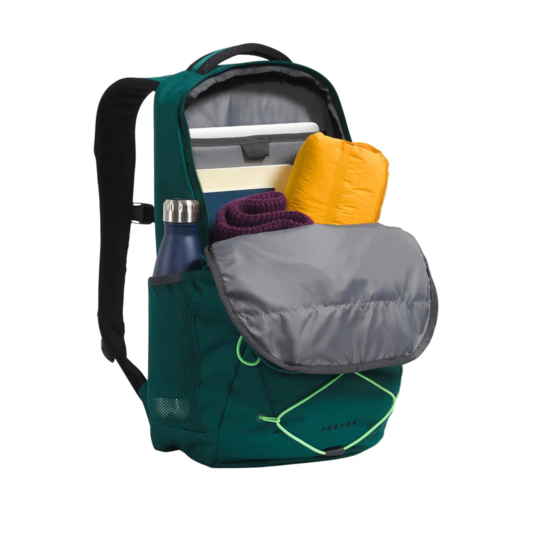 Mochila Jester unisex color verde, clásica con suspensión FlexVent™, base estable y funda laptop 16″. Organización frontal (tablet/llaves), 2 portabotellas y bungee. 740 g, poliéster 600D reciclado DWR sin PFC.
