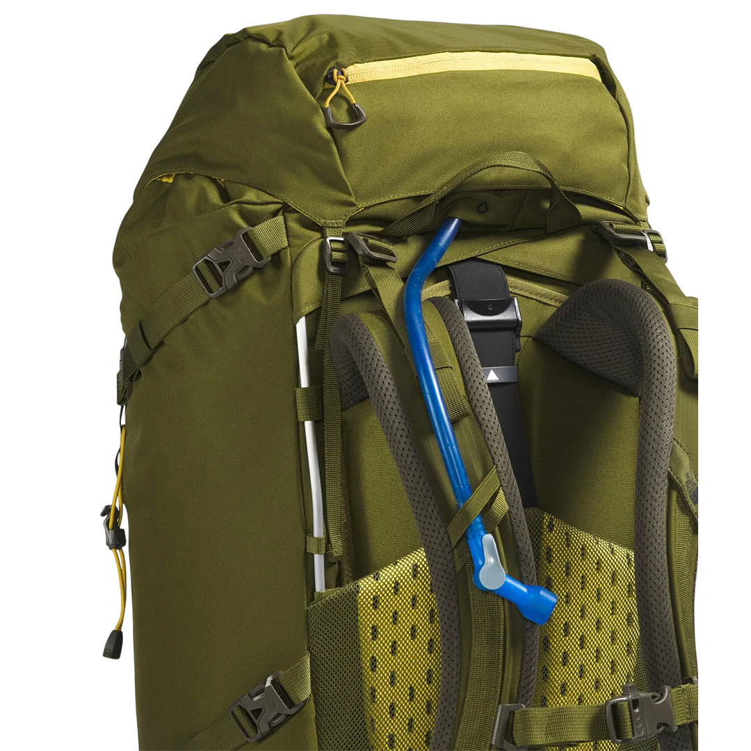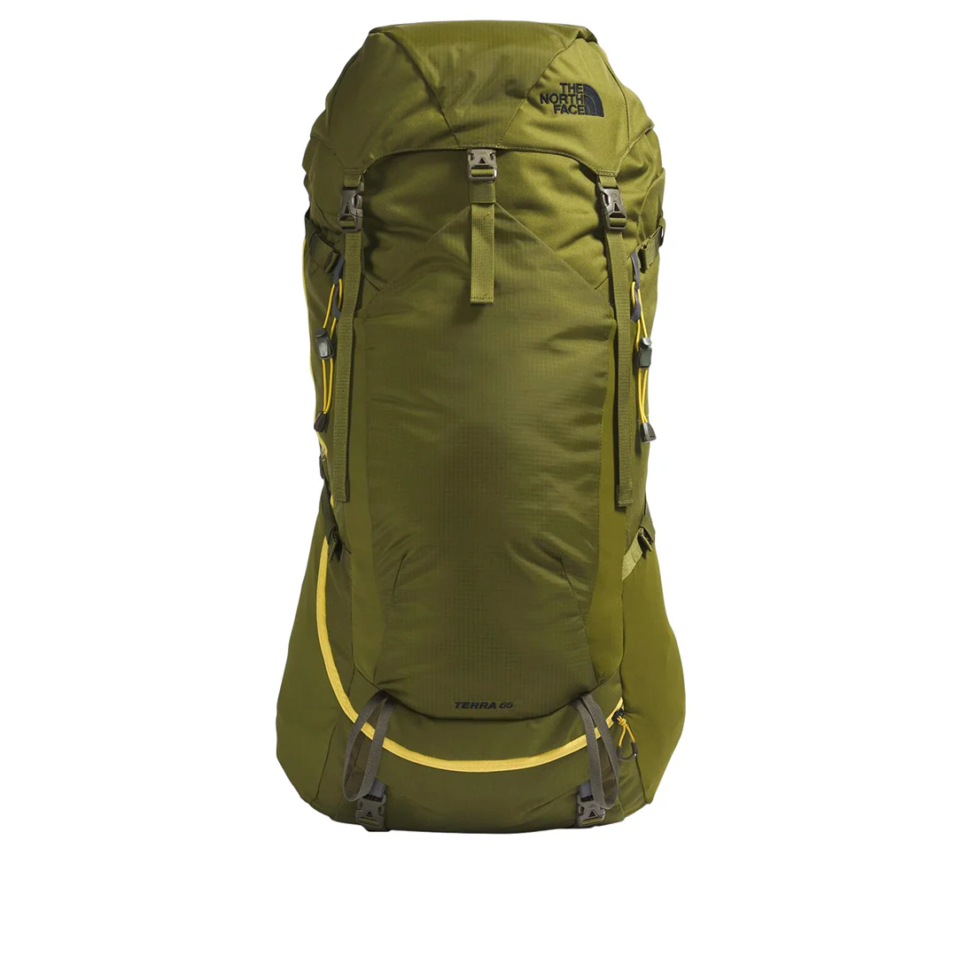 Mochila Terra 65 unisex color olivo, trekking con espalda/tirantes/hipbelt ventilados y ajuste torácico. U-zip de doble vía, tapa removible, bolsillos múltiples, portabotellas, sleeve de hidratación, compresión, porta bastones/piolet y frame sheet removible. 1950–2110 g.