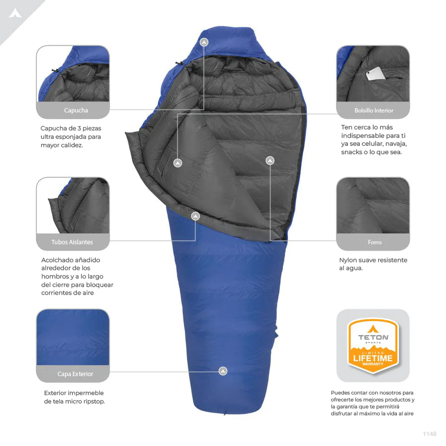 Mejora tu comodidad. Los sleeping bags ALTOS de TETON de relleno de plumas están diseñadas pensando en ti. Las plumas resistentes al agua se distribuyen perfectamente en todo el sleeping bag para mantenerte cálido y cómodo. Estos sleeping bags brindan más espacio para tus hombros, piernas y pies.